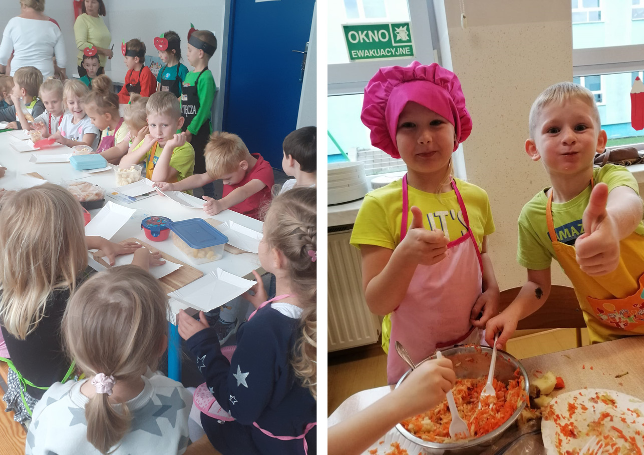 Tęczowe Przedszkolaki obchodziły Dzień Jabłka zdrowo i smacznie. Samodzielnie przygotowały owocowo warzywne sałatki , pieczone jabłuszka, owocowe koreczki oraz ciasteczka z jabłkiem. Mniam mniam!