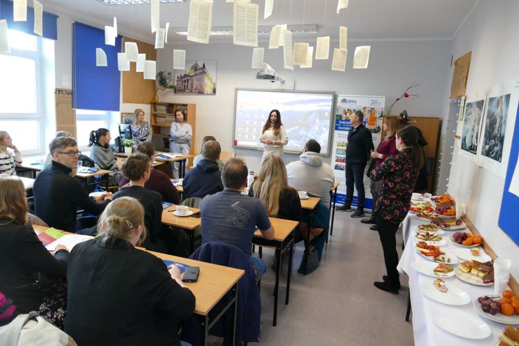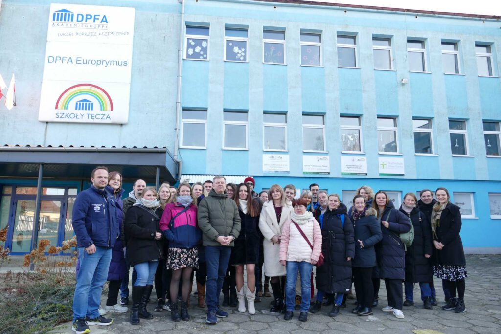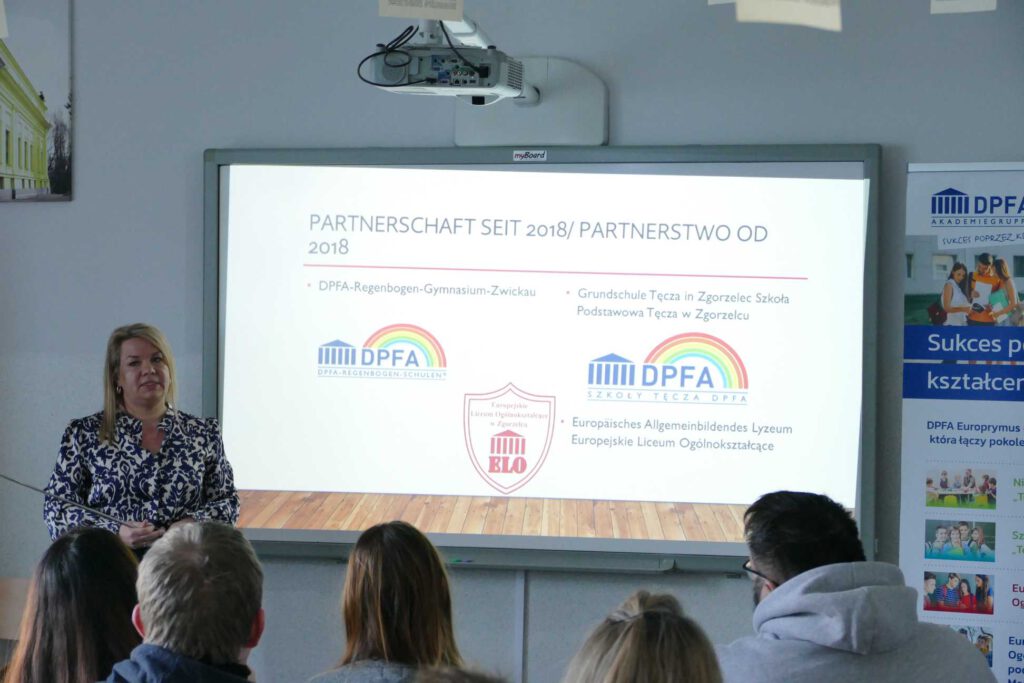 Pani Prezes Katrzyna Hübner oraz Pani Dyrektor Szkół Tęcza Agnieszka Olszewska przywitały gości i zapoznały z działalnością Szkół DPFA Europrymus w Zgorzelcu i Legnicy.